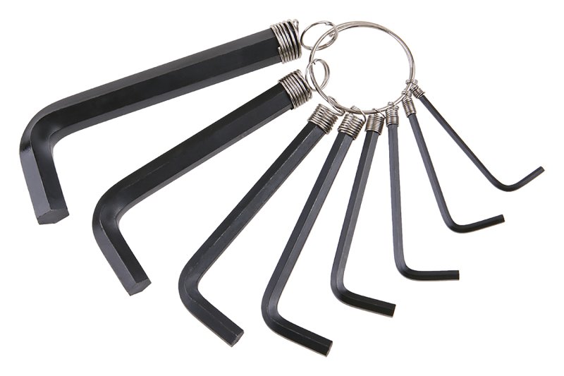set of the most used dimensions of L hex keys dimensions in set: 2, 2.5, 3, 4, 5, 6, 8, 10 mm quality steel, hardened along the entire length standard length according to DIN 911 suspended by elastic hinges on the ring